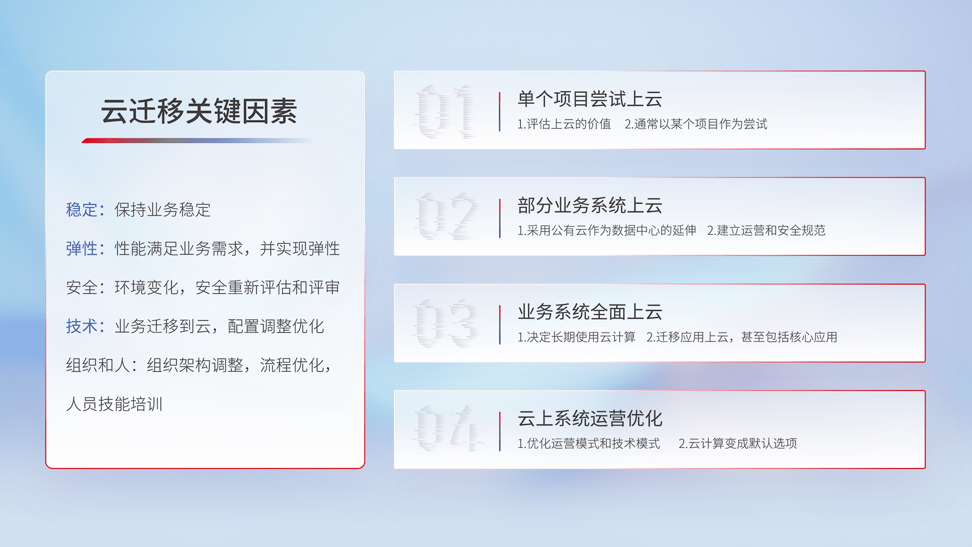 结合实际业务,,从规划设计、、、云平台选型、、、、云原生改造、、数据迁移、、、集成交付,,迁移全过程为客户识别最佳上云路径,,,,做好风险识别管理,,,设计网络架构、、身份权限、、安全审计合规、、、操作审计、、日志审计、、、监控告警策略、、、多站点容灾设计等,,,对云上基础设施进行整体规划,,,提升IT治理水平,,以满足弹性、、高可用、、高性能的需求。。